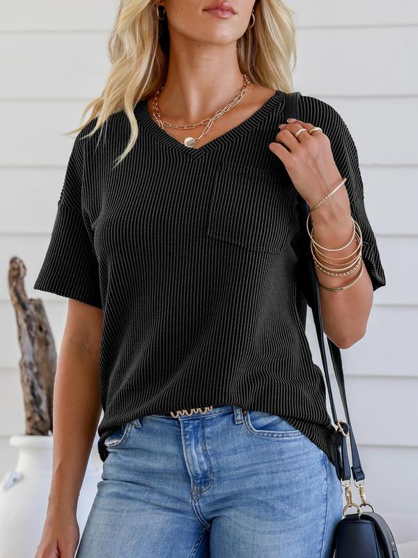Womens Casual Summer Springtok Short Sleeve T Shirts Oversized Ribbed Knitted Sexy V Neck Loose Blouses
