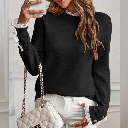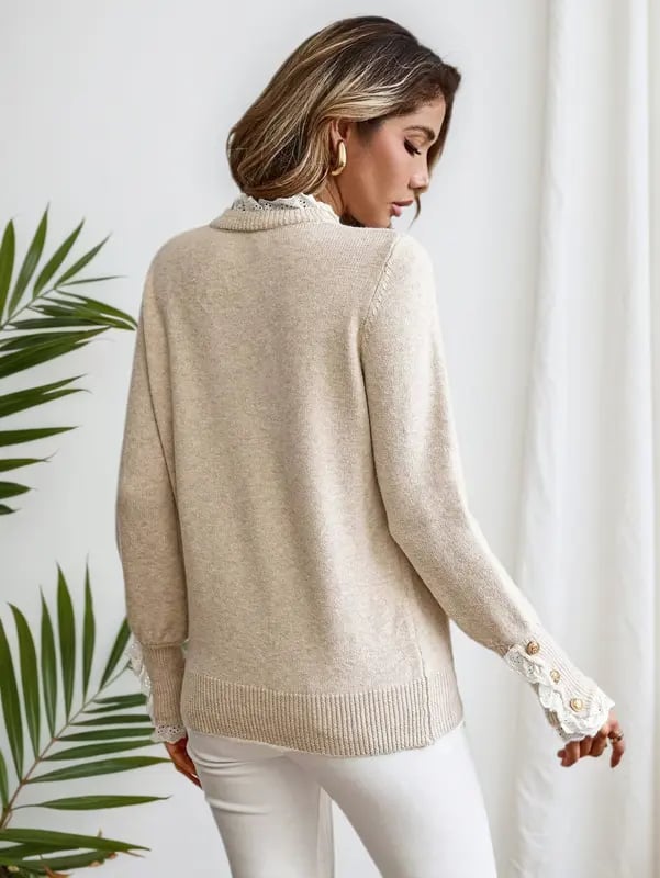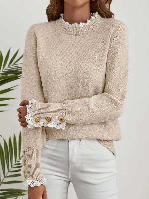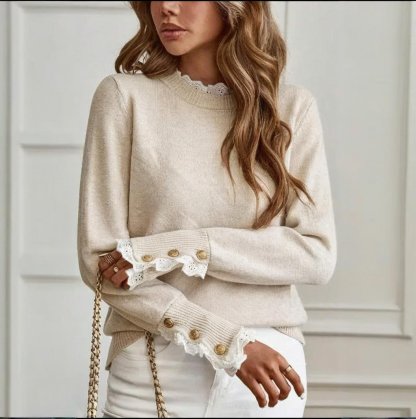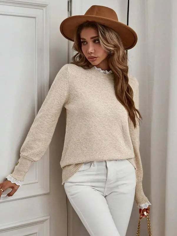 2025 Fashion Womenswear Fall Winter Round Neck Long Sleeve Knitted Sweater with Lace Trim Beige Color Chic Casual Knitwear Fitted Outfits Tops[Buy 2 Free Shipping]