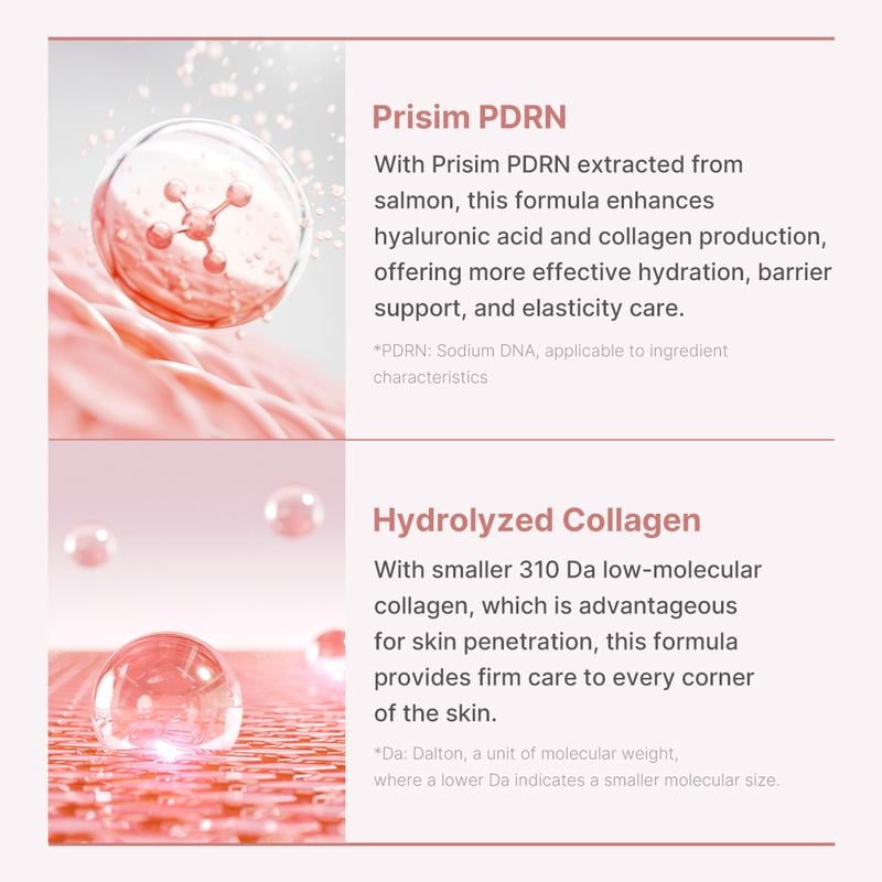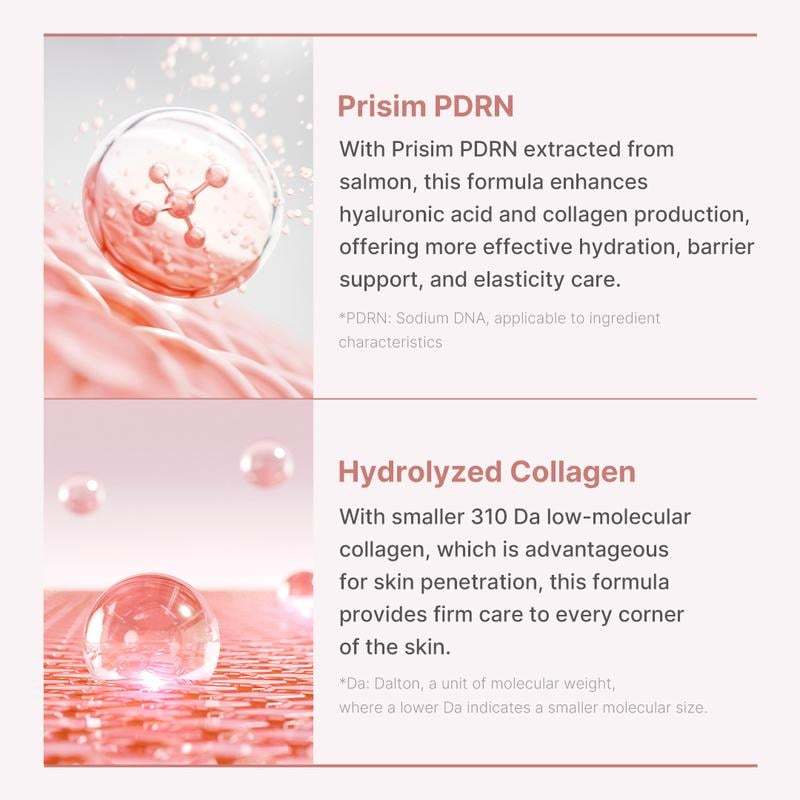 - Salmon PDRN & Low-Molecular Collagen: Work together to hydrate, firm, and brighten your skin.