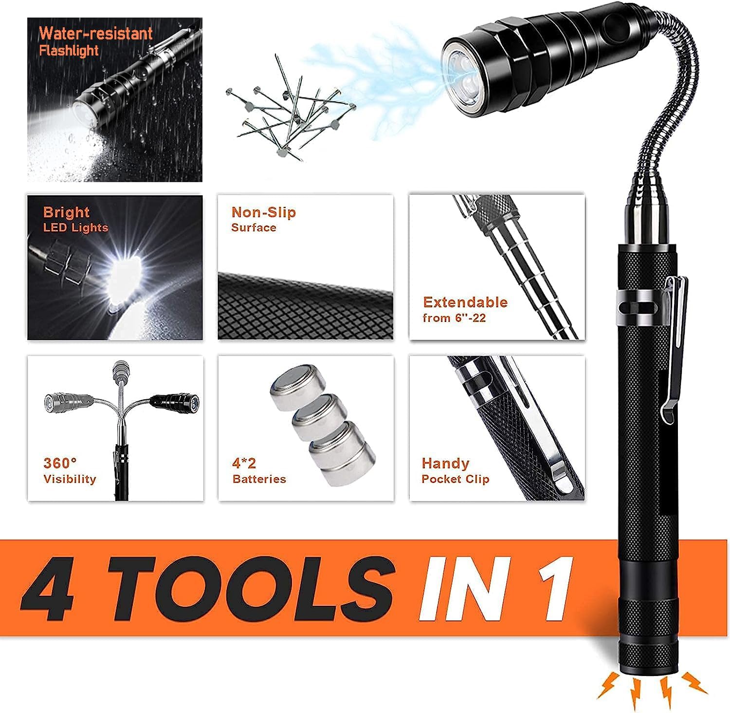 SUPER BRIGHT - Powered by pre-installed batteries, each telescopic tool magnet has 3 LED lights to provide visibility in dark spaces (spare batteries included). The grab wand is a life-saver in crawl spaces and attics
