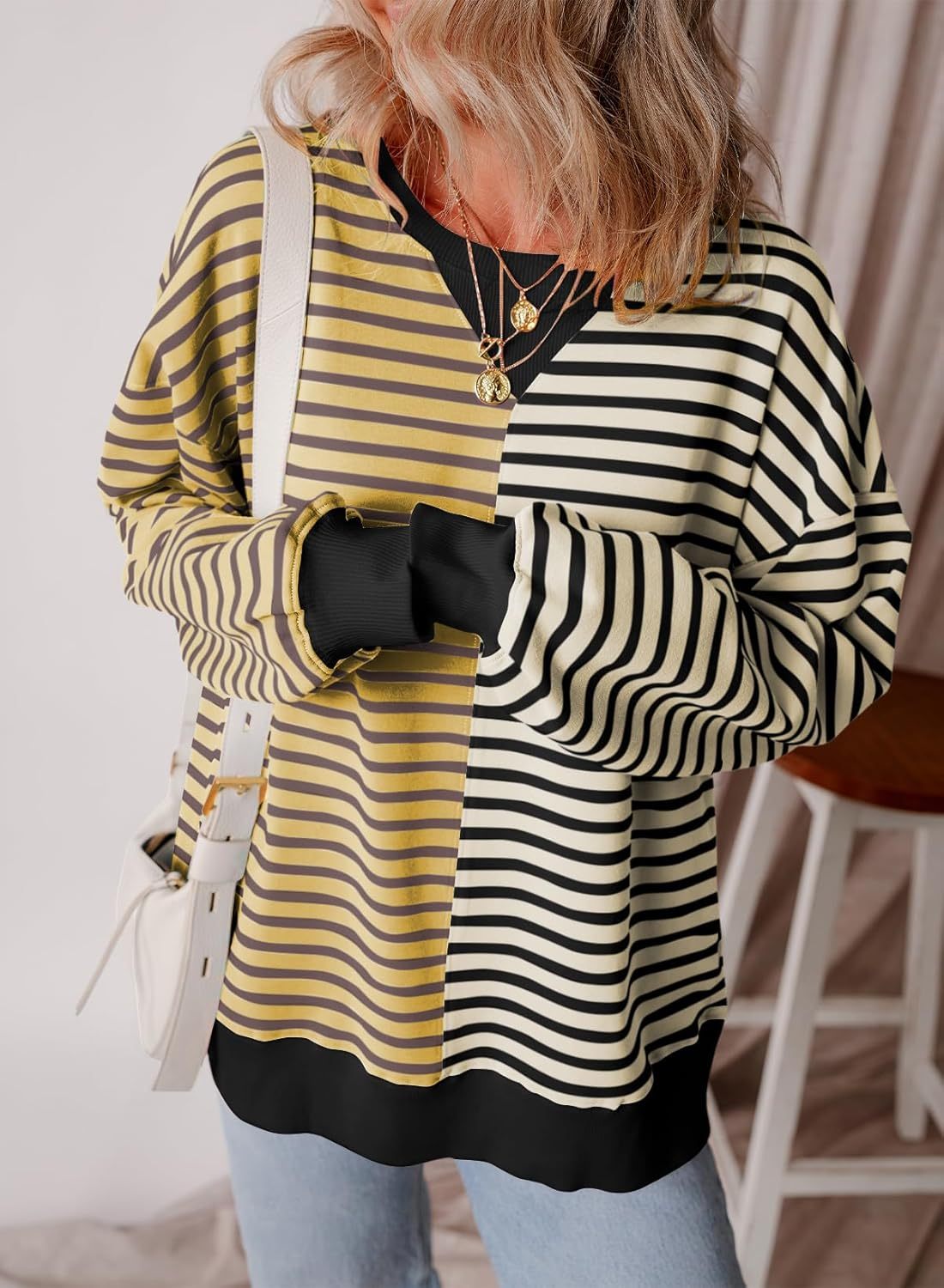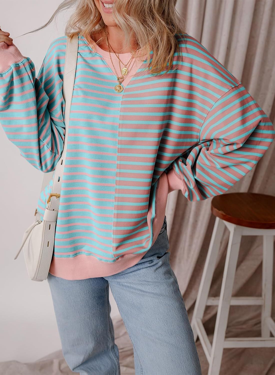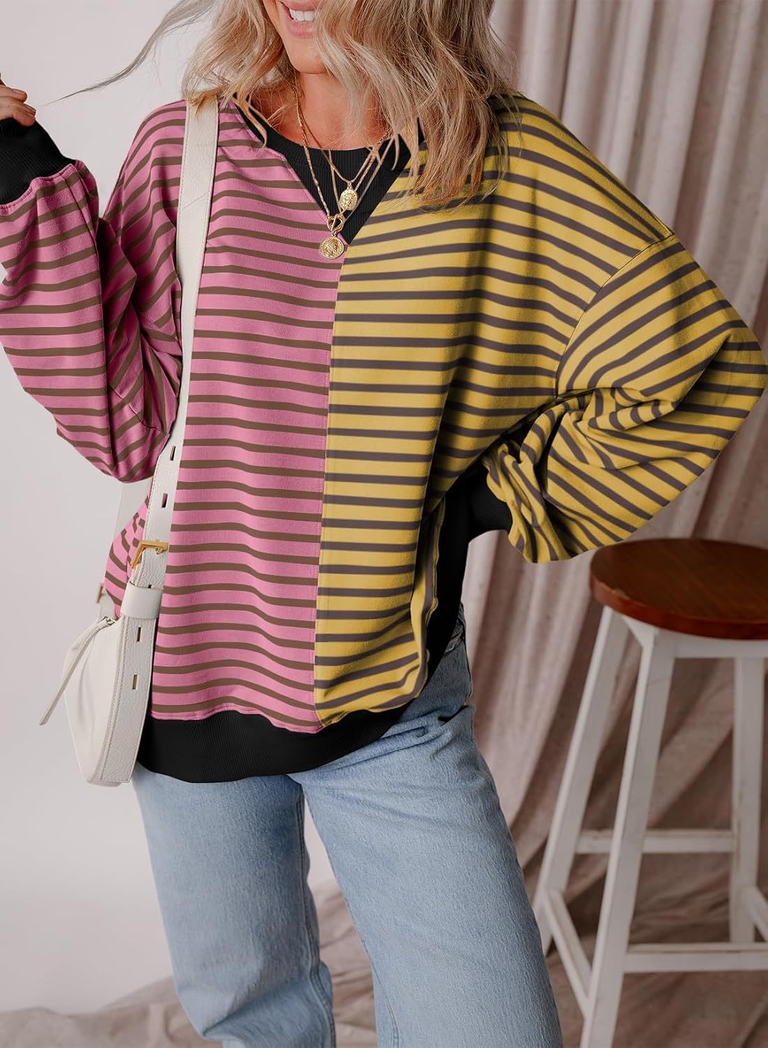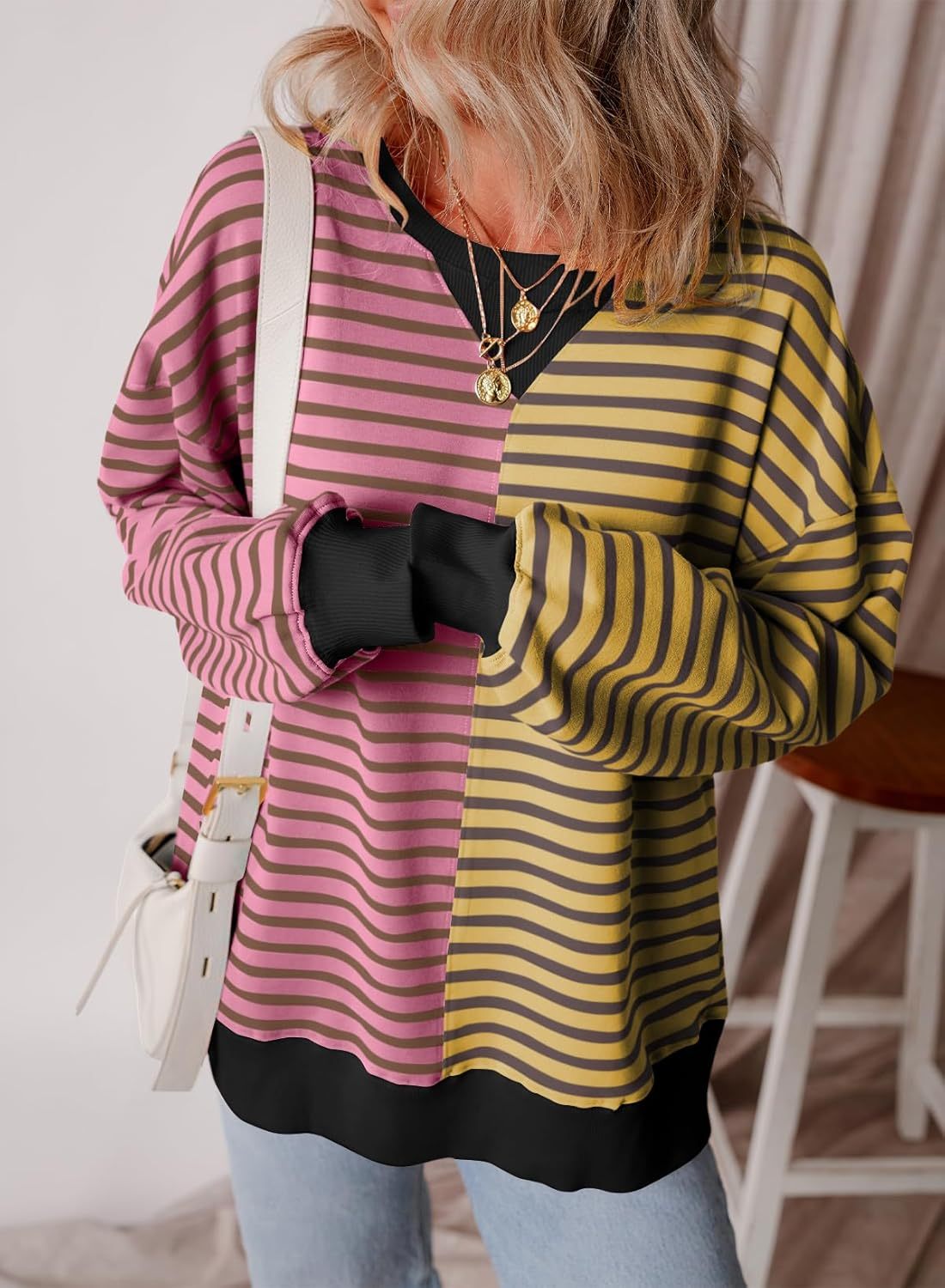 Women’s Oversized Sweatshirts Striped Color Block Crewneck Sweatshirt